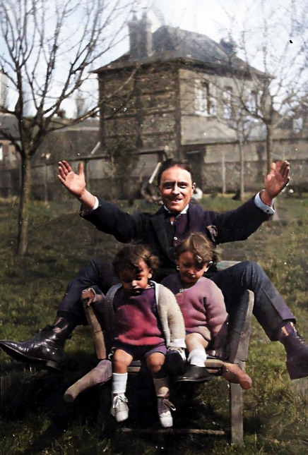Rare photo, certes floue, de Georges souriant avec Pierre-Yves en 1949